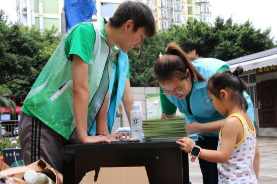 利用公司和社区提供的物资在社区布置好活动现场后,小分队为队员们分配工作,每个人负责自己的活动版块,现场秩序有条不紊。垃圾分类活动具体流程如下:活动参与人员在签到处签到,填写基本信息和公司前期准备的调查问卷,领取垃圾分类知识宣传小手册以及活动积分卡,随后在小分队成员的引导下参与各种垃圾分类小游戏,成功通过小游戏则可获取积分兑换小分队为居民准备的精美奖品。