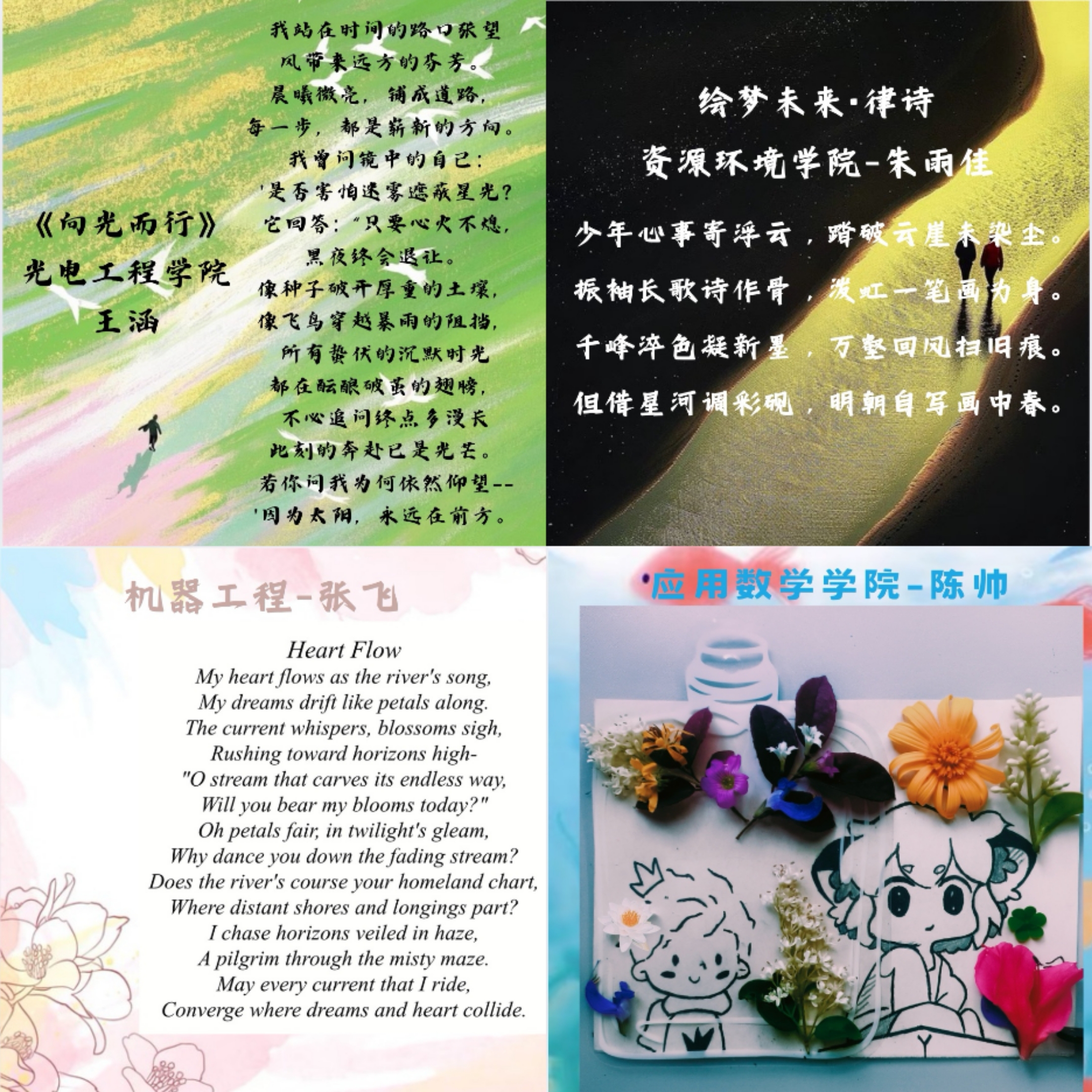 活动开展以来,受到了同学们的广泛关注与积极响应。同学们充分发挥想象力与创造力,投稿了很多优秀作品。在诗歌组中,通过细腻的笔触书写对未来的憧憬,抒发面对挑战时的坚定信念。绘画作品组里,斑斓的色彩、独特的构图将同学们心中的美好愿景具象化。最终,心晴驿站工作室秉持公平公正原则,评选出四个赛道的获奖者,分别为:现代诗赛道——光电工程公司王涵等两位同学,律诗赛道——好博体育朱雨佳等两位同学,英文诗赛道——自动化公司张飞等两位同学,绘画赛道——应用数学公司陈帅等两位同学。